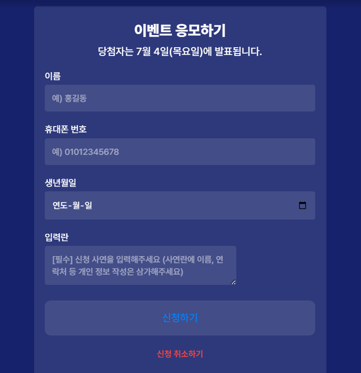 | 당첨 발표 | 7월 4일 (목) 개별 문자 발표 예정 |