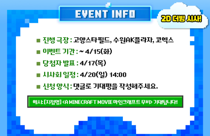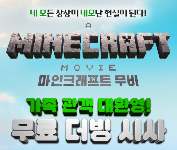 개봉 전 더 빠르게 ' 마인크래프트 무비 '를 만나볼 수 있는 무료 더빙 시사회 이벤트를 한다고 합니다. 메가박스와 CGV에서 각각 따로 신청하셔서 진행되니 날짜 및 시사회 극장 확인하시고 꼭 시사회 신청하셔서 미리 ' 마인크래프트 무비 '를 만나보시기 바랍니다.
