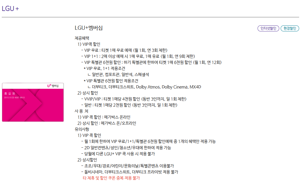 메가박스는 통신사 중 LGU+ 멤버십이 큰 할인혜택이 제공됩니다.