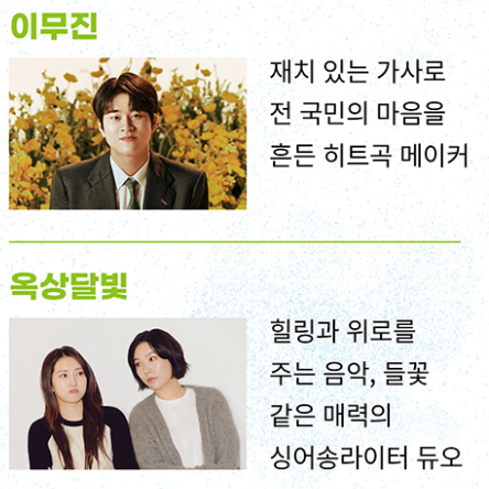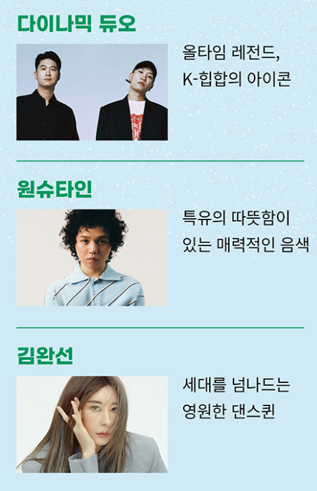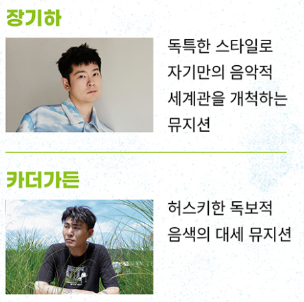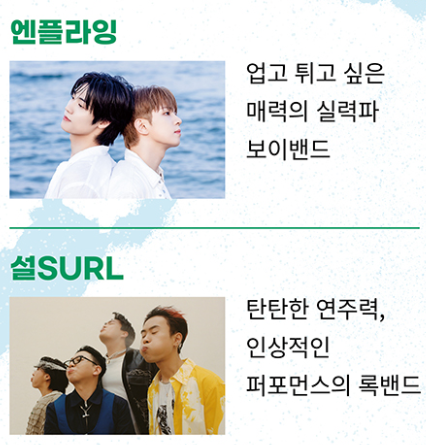 | 공연 라인업 | ★ 9/7(토) 밴드 인 더 파크 : 엔플라잉 / 설SURL ![]() ★ 9/14(토) 싱어송라이터 인 더 파크 : 장기하 / 카더가든 ![]() ★ 9/21(토) 트로트 스타 인 더 파크 : 장민호 / 양지은 / 정동원 ![]() ★ 9/28(토) 감성보컬 인 더 파크 : 이무진 / 옥상달빛 ![]() ★ 10/5(토) 힙스터 인 더 파크 : 다이나믹 듀오 / 원슈타인 / 김완선 ![]() |