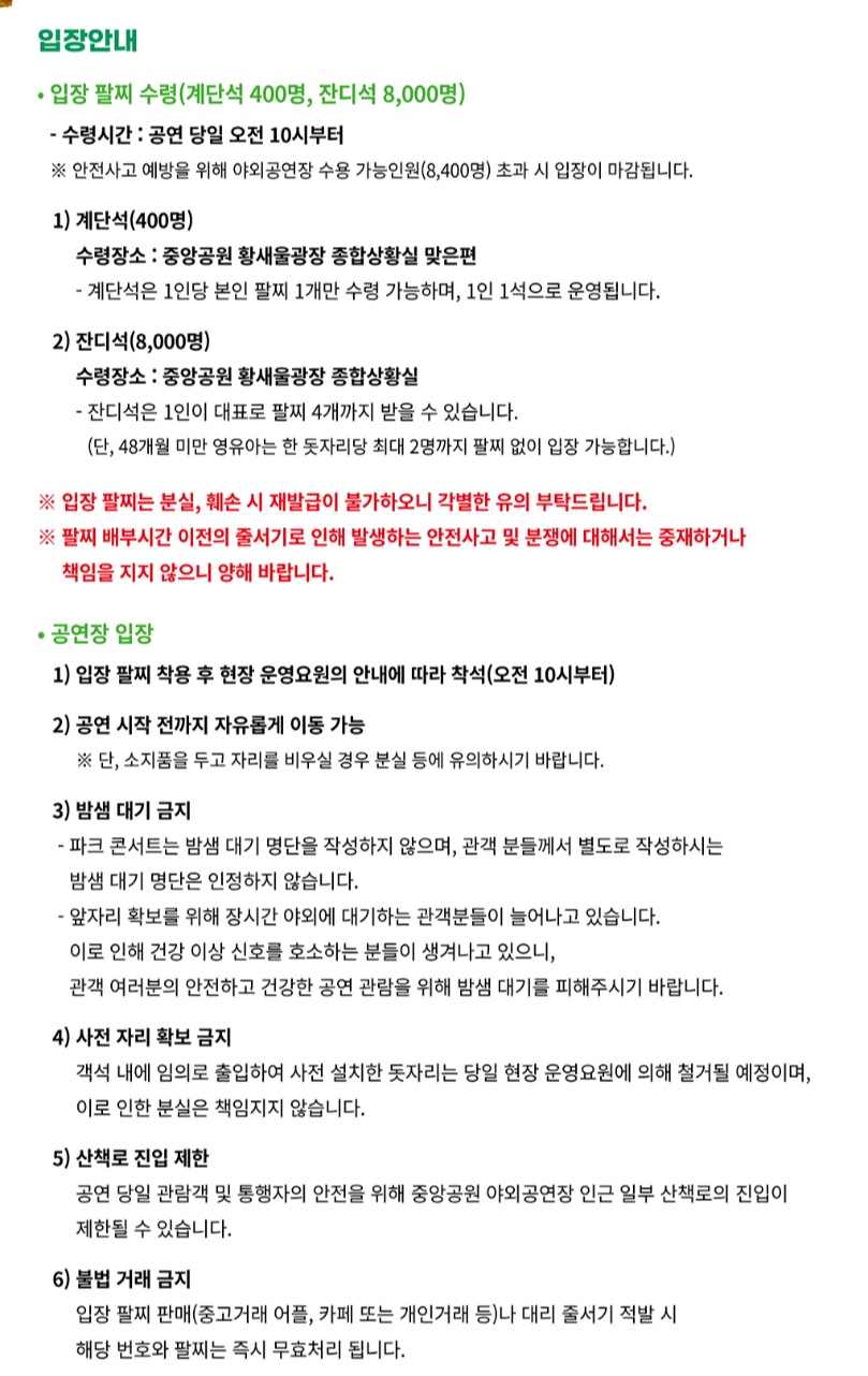 | 입장 안내 | * 입장 팔찌 수령 (공연 당일 오전 10시 부터 수령) ※ 계단석 400명 - 수령장소 : 중앙공원 황새울광장 종합상황실 맞은편 (1인당 본인팔찌 1개만 수령가능, 1인 1석으로 운영) ※ 잔디석 8,000명 - 수령장소 : 중앙공원 황새울광장 종합상황실 (1인 대표로 팔찌 4개까지 수령가능, 48개월 미만은 2명까지 팔찌없이 입장가능) * 공연장 입장 (오전 10시부터 입장팔찌 착용 후 입장가능) - 공연 시작 전까지 자유롭게 이동가능 - 밤샘 대기 금지 - 사전 자리 확보 금지 - 산책로 진입 제한 - 불법 거래 금지 |