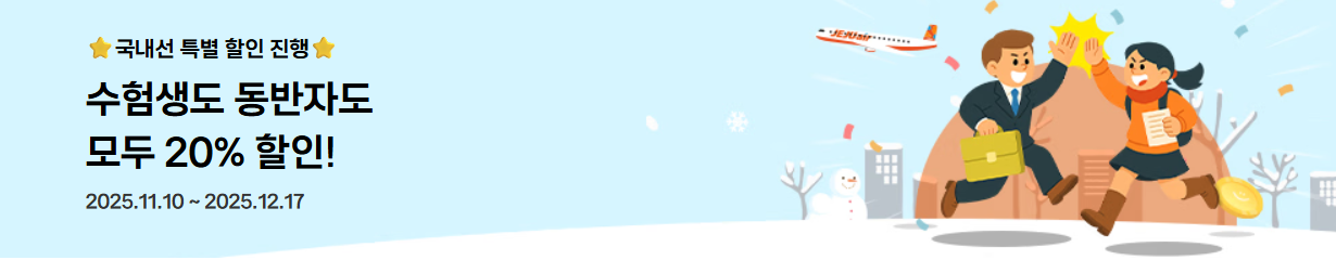 ① 제주항공 수험생 할인 [ 수험생 + 동반 1인 국내선 한정 20% 특별할인 ]