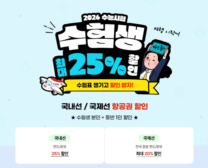 ② 티웨이항공 수험생 할인 [ 수험생 + 동반 1인 국내선 / 국제선 최대 25% 특별할인 ]