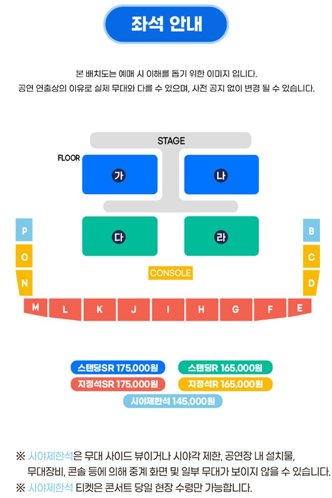 | 티켓 가격 | 스탠딩SR 175,000원 스탠딩R 165,000원 지정석SR 175,000원 지정석R 165,000원 시야제한석 145,000원 ![]() |