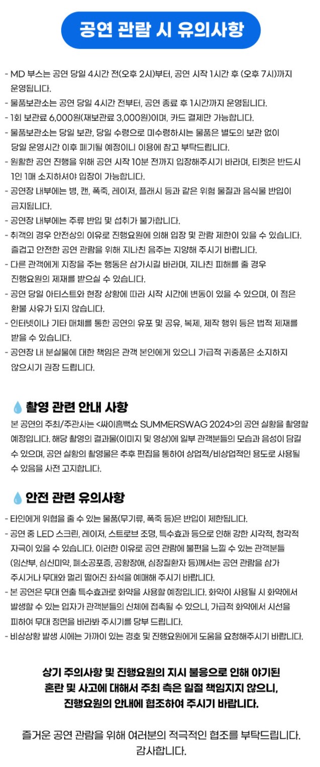| 티켓 배송 | 6.10(월)~6.30(일) 결제 완료한 예매 티켓에 한하여 7월 1일(월) 부터 순차 배송 이후 예매하시는 분들은 현장 수령 진행 |
