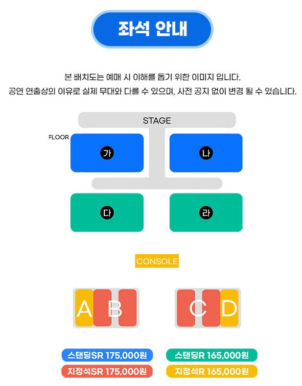 | 티켓 가격 | 스탠딩SR 175,000원 스탠딩R 165,000원 지정석SR 175,000원 지정석R 165,000원 ![]() |