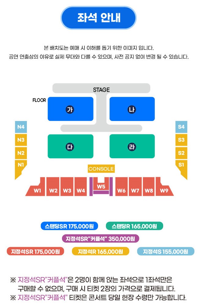 | 티켓 가격 | 스탠딩SR 175,000원 스탠딩R 165,000원 지정석SR 커플석 350,000원 지정석SR 175,000원 지정석R 165,000원 지정석S 155,000원 ![]() |