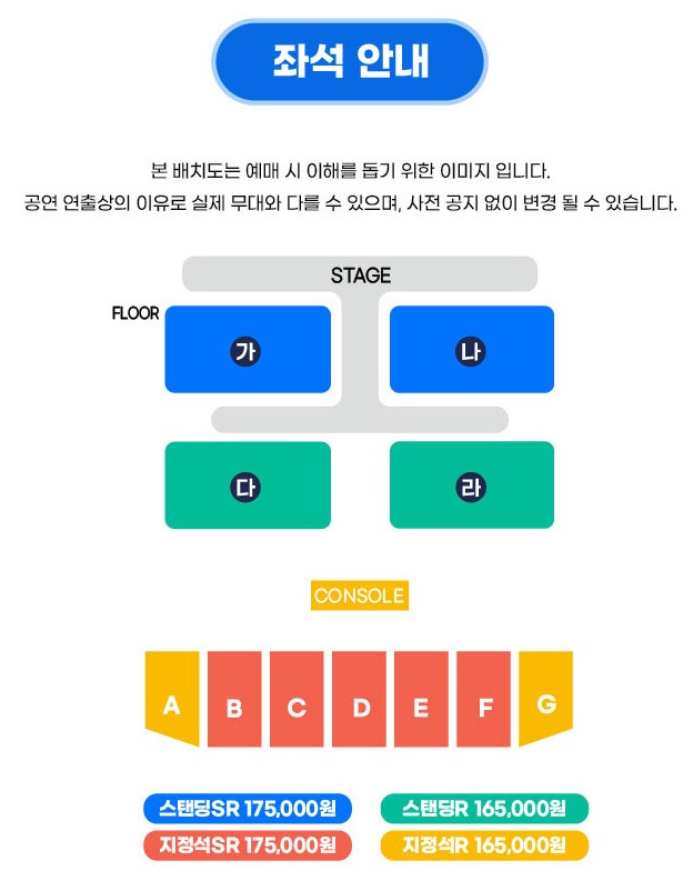| 티켓 가격 | 스탠딩SR 175,000원 스탠딩R 165,000원 지정석SR 175,000원 지정석R 165,000원 ![]() |