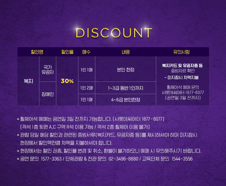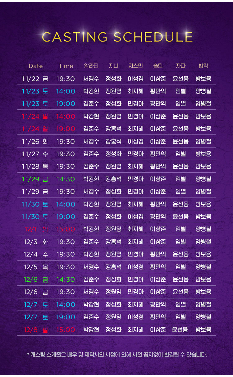| 공연 시간 | 150분 (인터미션 20분 포함) - 화,수,목요일 19:30 - 금요일 14:30 / 19:30 - 토요일 14:00 / 19:00 - 일요일 15:00 |
