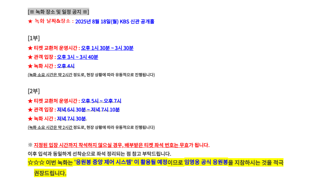 1부, 2부 녹화 시간 및 입장시간, 티켓교환처 운영 시간이 다릅니다. 이 점 꼭 확인 후 가시기 바랍니다. 그리고 이번 녹화에는 프로그램 규정상 만 15세 미만은 입장이 불가하다고 합니다. 이 점 또한 꼭 참고하시기 바랍니다.