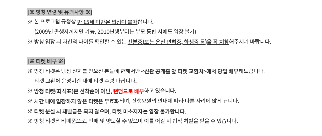 방청 티켓(좌석표)는 선착순이 아닌 랜덤으로 배부된다 합니다. 미리 일찍부터 가서 기다리시는 일이 없으시기 바랍니다.
