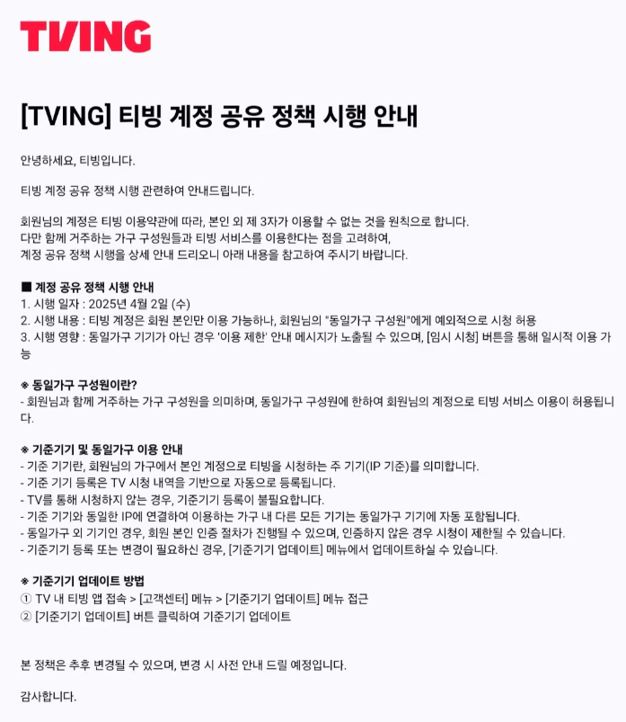 - 시행 내용 : 티빙 계정은 회원 본인만 이용 가능하나, 회원 " 동일가구 구성원"에게 예외적으로 시청 허용