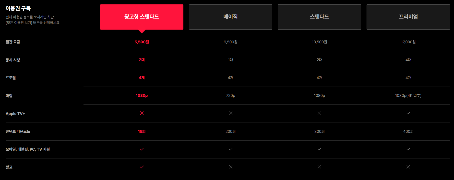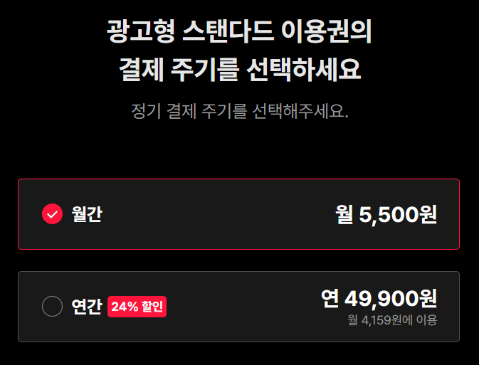 : 다른 요금제 보다 저렴한 요금으로 1080p 고품질 화질로 시청할 수 있는 요금제입니다. 월 5,500원 이용료이며 연간결제 시 24% 할인된 연 49,900원 (월 4,159원)이라는 금액적으로 메리트 있는 요금제입니다.