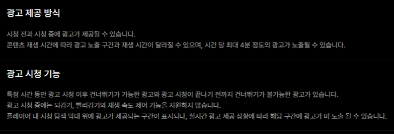 단점은 영상 시청 전, 영상 시청 중 광고가 나올 수 있으며, 일부 콘텐츠 이용에 제한이 있을 수 있습니다. 광고형 스탠다드 요금제이기 때문에 영상 시청 중 광고가 나오는 큰 단점이 있지만, 상대적으로 저렴한 금액 메리트와 고품질 화질 또한 큰 장점 일 수 있습니다.