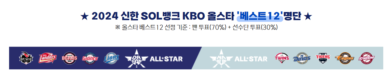 올스타전 출전선수 교체(2024.7.3. 공지)드림팀 - 내야수 손호영(롯데) -> 박지환(SSG)외야수 에레디아(SSG) -> 황성빈(롯데) 나눔팀 - 투수 정해영(기아) -> 장현식(기아) 내야수 이웅성(기아) > 송성문(키움) |