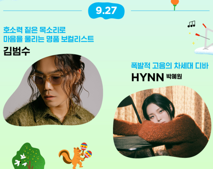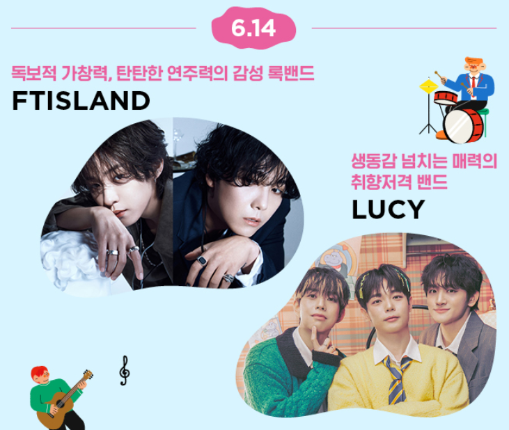 공연 라인업 | ○ 2025년 6월 14일(토) : FT아일랜드 / LUCY ![]() ○ 2025년 9월 27일(토) : 10CM / 다비치 ![]() ○ 2025년 9월 6일(토) : 김범수 / 박혜원 ![]() |