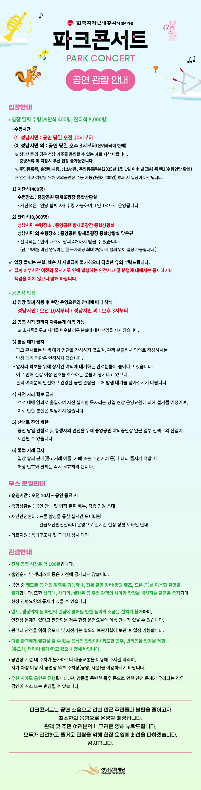 입장 안내 | * 입장 팔찌 수령 (공연 당일 오전 10시 부터 수령) - 수령시간 ① 성남시민 : 공연 당일 오전 10시부터 (성남거주 증빙자료 지참 필수) ② 성남시민 외 : 공연 당일 오후 3시부터 (잔여좌석에 한해) ※ 계단석 400명 - 수령장소 : 중앙공원 황새울광장 종합상황실 (1인당 팔찌 2개만 수령가능, 1인 1석으로 운영) ※ 잔디석 8,000명 - 수령장소 : 성남시민 수령장소 : 중앙공원 황새울광장 종합상황실 성남시민 외 수령장소 : 중앙공원 황새울광장 종합상황실 맞은편 (1인 대표로 팔찌 4개까지 수령가능, 48개월 미만은 2명까지 팔찌없이 입장가능) * 공연장 입장 (오전 10시부터 입장팔찌 착용 후 입장가능) - 공연 시작 전까지 자유롭게 이동가능 - 밤샘 대기 금지 - 사전 자리 확보 금지 - 산책로 진입 제한 - 불법 거래 금지 |