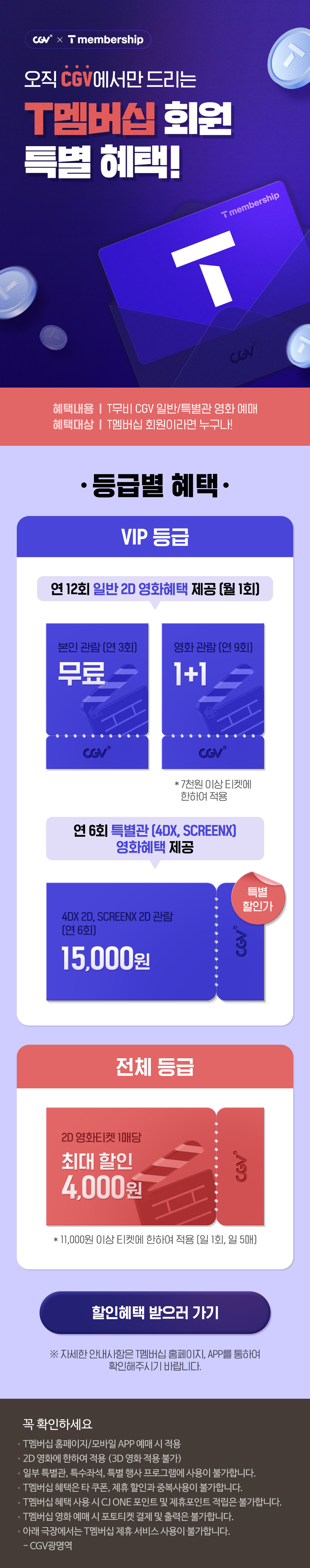 * VVIP/VIP 등급할인은 월1회 사용 가능 * 2D 일반영화에 한함(3D,4D,CGV지정 특화관 제외) |